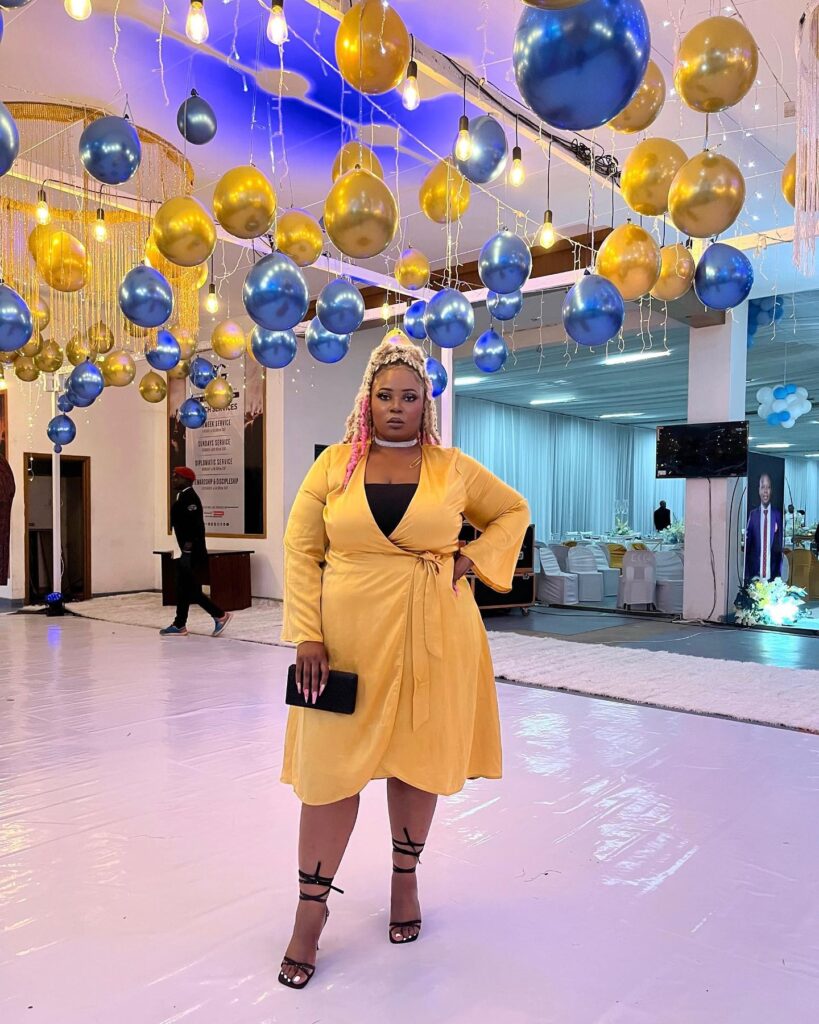 This eye-catching mustard wrap dress is a confident and stylish choice for a birthday celebration. The wrap silhouette cinches the waist beautifully with a side tie, while the V-neckline layered over a black camisole adds a touch of contrast and modesty.