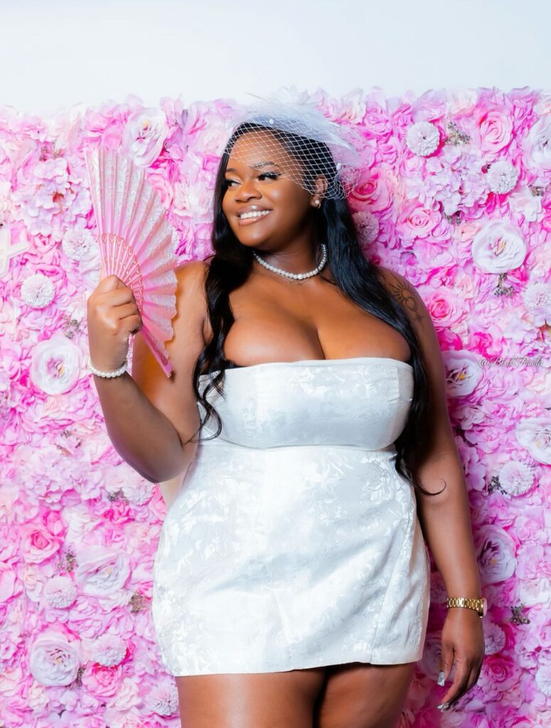 A pearl necklace and bracelet add timeless charm, and the delicate birdcage veil brings vintage glam to the celebration. Paired with flowing waves and a playful pink fan, this outfit is perfect for a photo shoot, brunch, or fancy birthday soirée. It’s a stunning and unique way to feel like a queen on your special day.