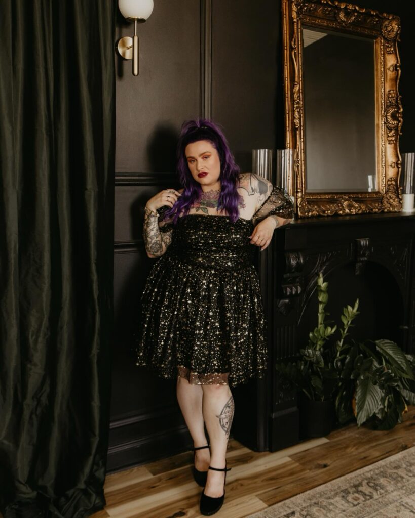 The sheer long-sleeve overlay adds drama and dimension, while black Mary Jane heels keep the look grounded in vintage elegance. Bold purple hair and visible tattoos give the outfit an edgy, artistic flair. It’s a statement-making look that blends glam, mystery, and personality—ideal for a night of sparkle and celebration.