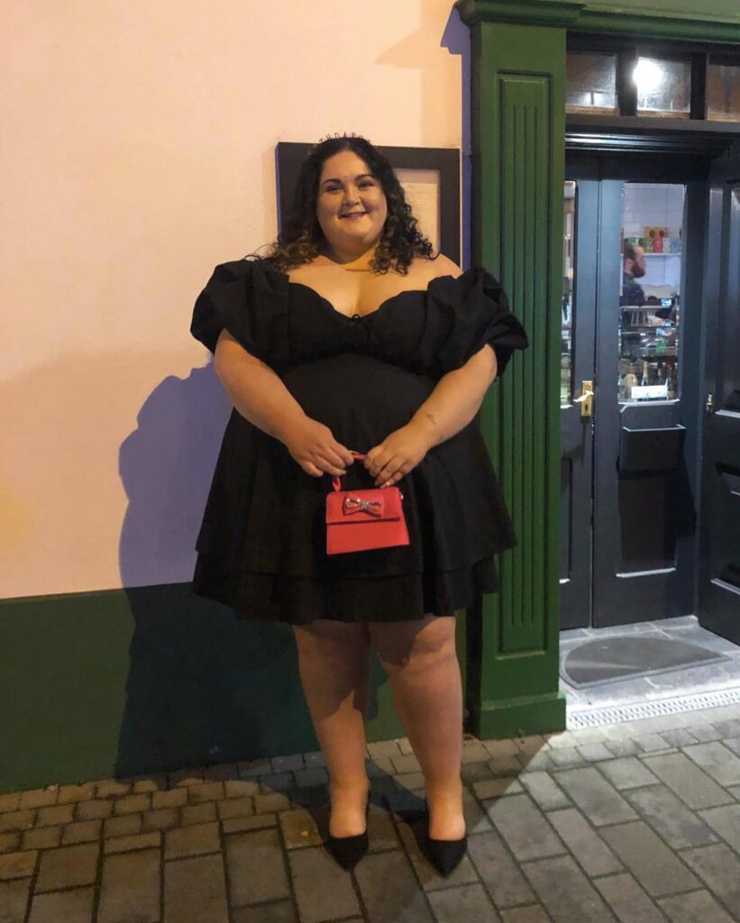 This birthday outfit blends timeless elegance with playful charm. The off-shoulder black mini dress features a dramatic sweetheart neckline and puff sleeves that add volume and flair. Its layered skirt brings movement, while black pointed-toe heels keep the look sleek and polished.