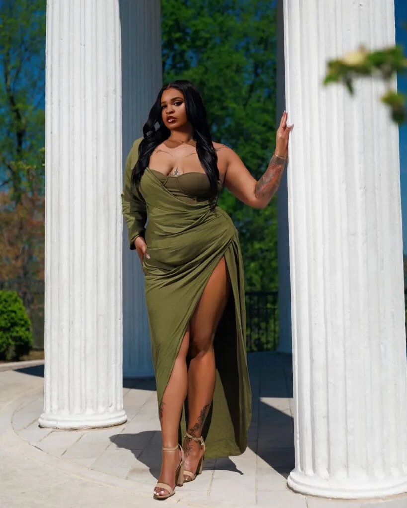This olive green one-shoulder gown radiates power, elegance, and birthday glam. The structured corset-style top enhances the bust, while the flowing draped fabric flatters the curves and adds movement.