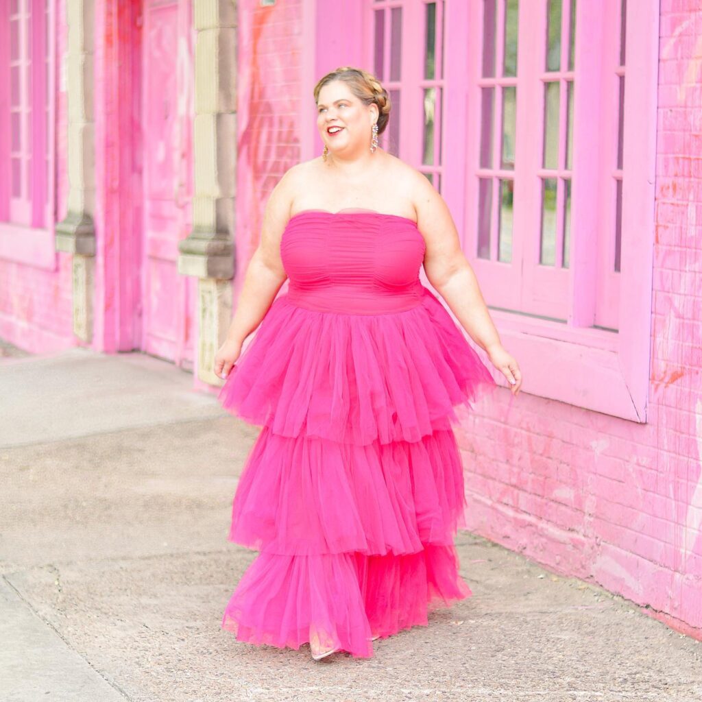 This vibrant pink strapless gown is a showstopper perfect for a bold birthday celebration. Featuring multiple tiers of voluminous tulle, the dress brings playful drama while highlighting the waist with a fitted bodice.