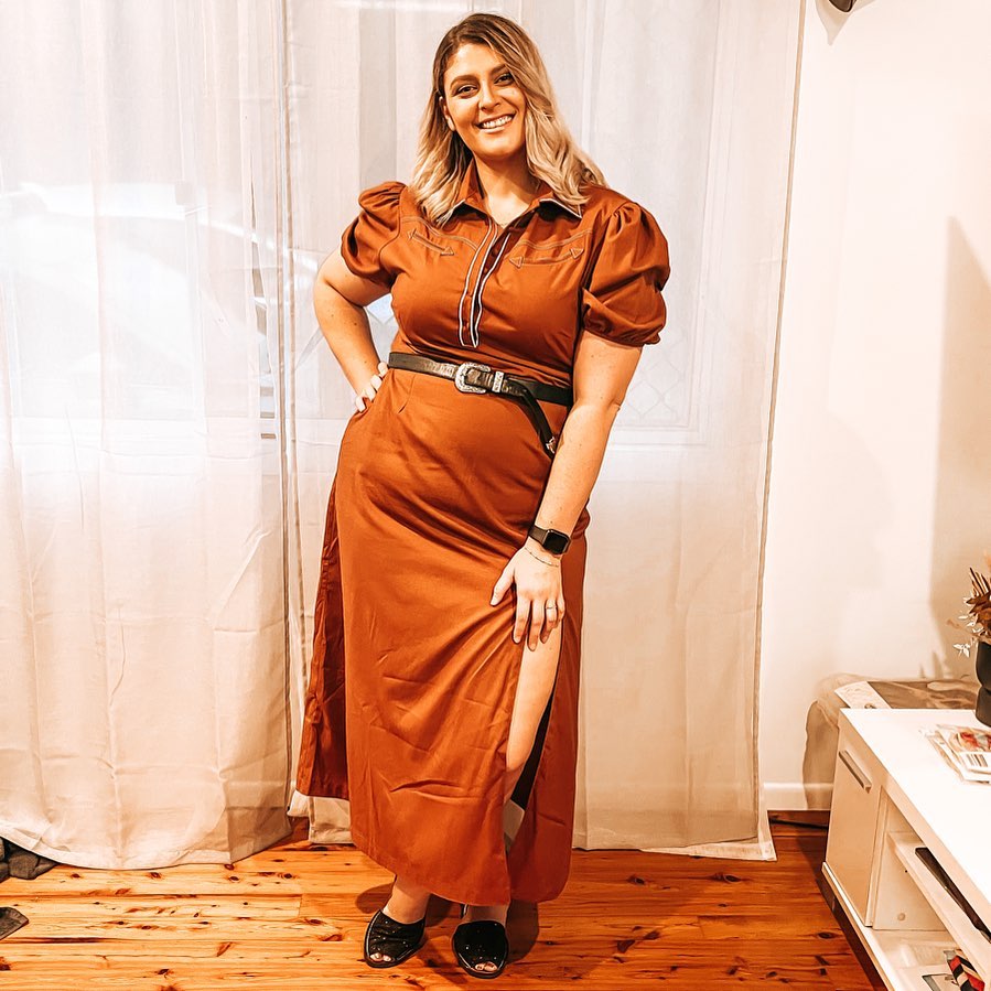 This belted rust shirt dress blends utility style with birthday glam. The structured design features puffed sleeves, chest pockets, and contrasting trim at the neckline for a playful edge.