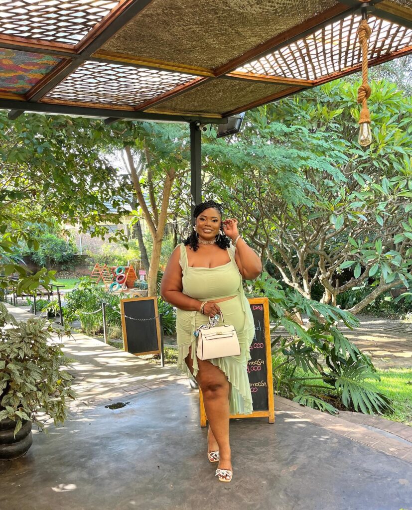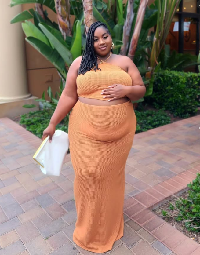 This warm-toned two-piece set is a radiant and relaxed birthday look. Featuring a textured bandeau top with halter detailing and a matching floor-length skirt, the outfit flatters curves while keeping the vibe effortlessly chic.