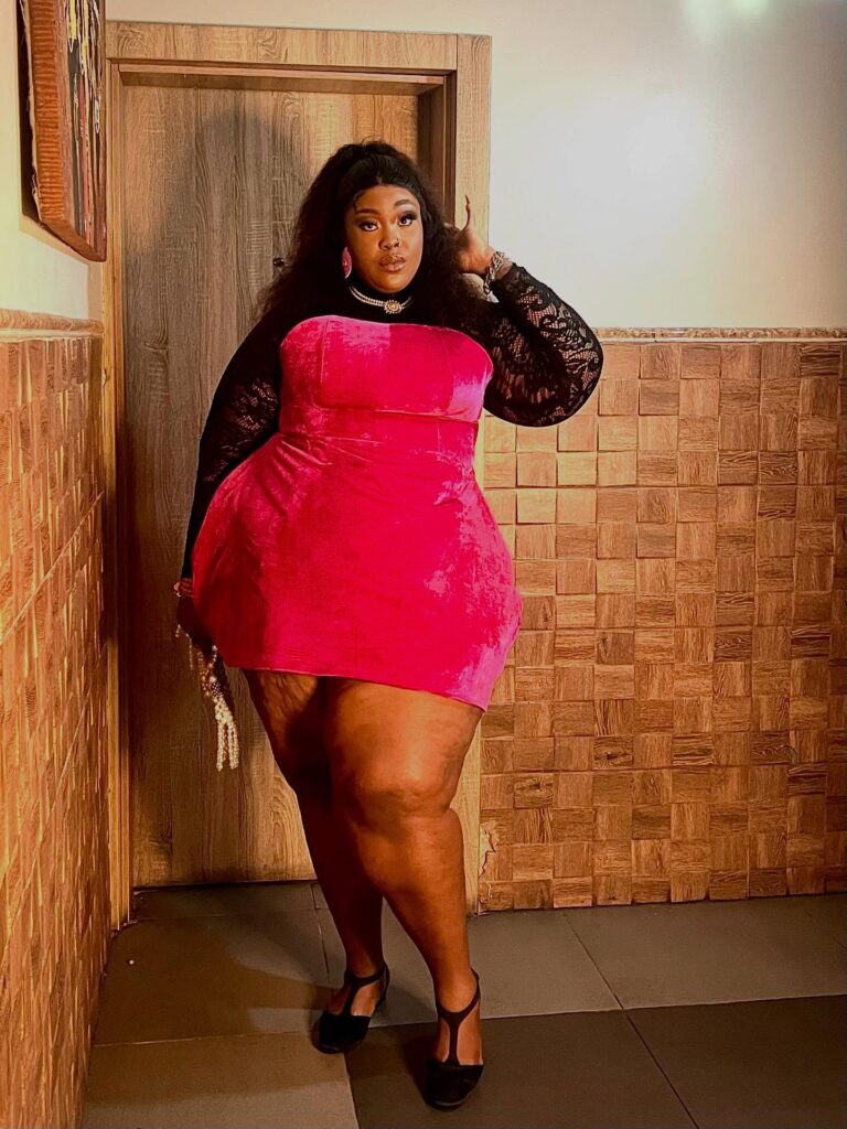 This fierce birthday look brings all the glamour with a bold twist. The hot pink velvet mini dress makes a powerful statement, hugging the curves while staying playful and eye-catching. Black lace sleeves add contrast and texture, giving the outfit an elegant edge.