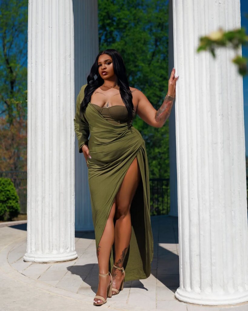 A dramatic thigh-high slit shows off the legs and tattoos beautifully, creating a sultry yet regal vibe. Paired with nude ankle-strap heels and long cascading waves, this look is fit for a queen ready to celebrate in high fashion. It’s the ultimate choice for a luxe birthday shoot or formal evening celebration.