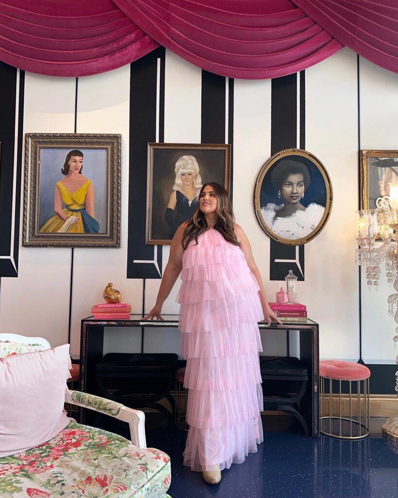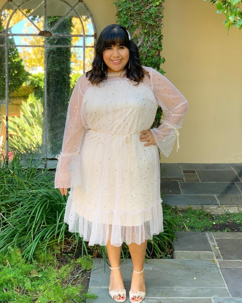 The soft pleated detail gives the look a flirty edge, balanced by a structured mini handbag and white sandals with crystal embellishments. Statement earrings and a rhinestone choker elevate the outfit with a hint of glam. It’s a beautiful, breezy choice that blends elegance and ease in the most flattering way.