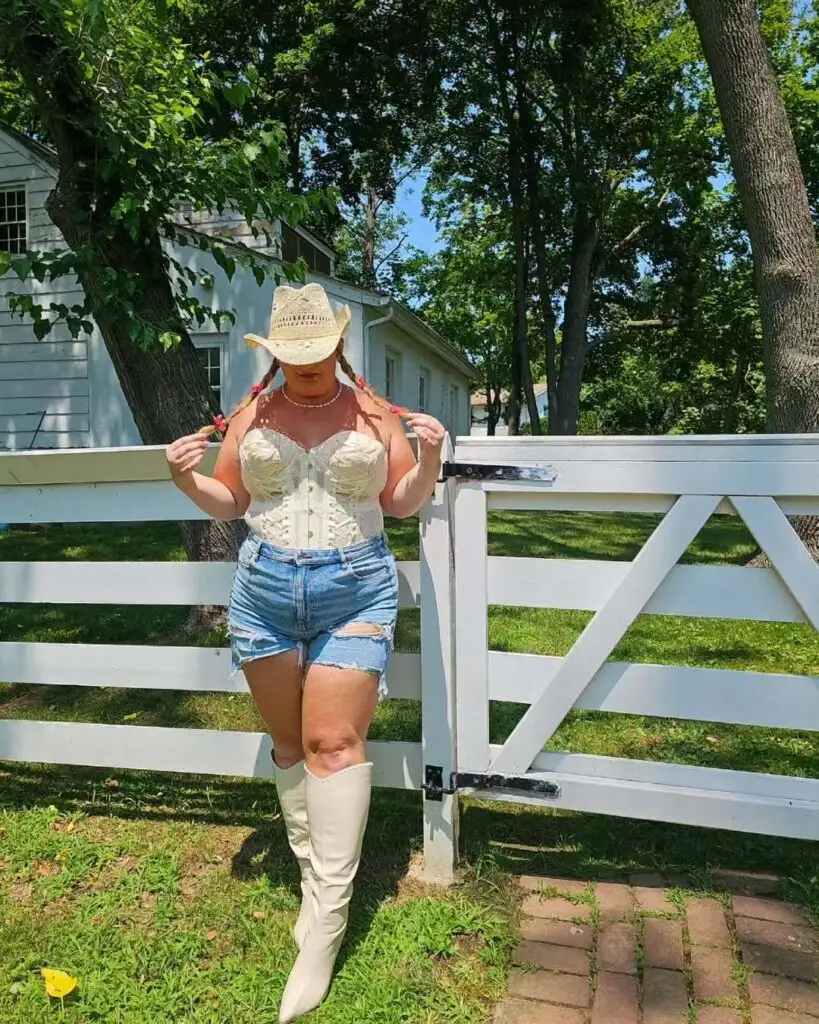 This plus-size cowgirl outfit blends feminine flair with rustic style. The cream corset top adds a touch of vintage romance and enhances the silhouette with its structured bodice. Paired with high-rise distressed denim shorts, the look stays casual yet bold.