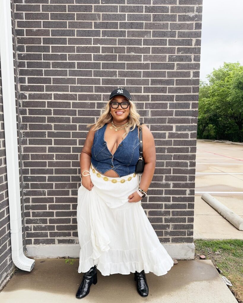This plus-size cowgirl outfit fuses boho flair with denim edge. The fitted sleeveless denim top adds a structured contrast to the flowy white maxi skirt, creating a flattering silhouette with a carefree spirit.