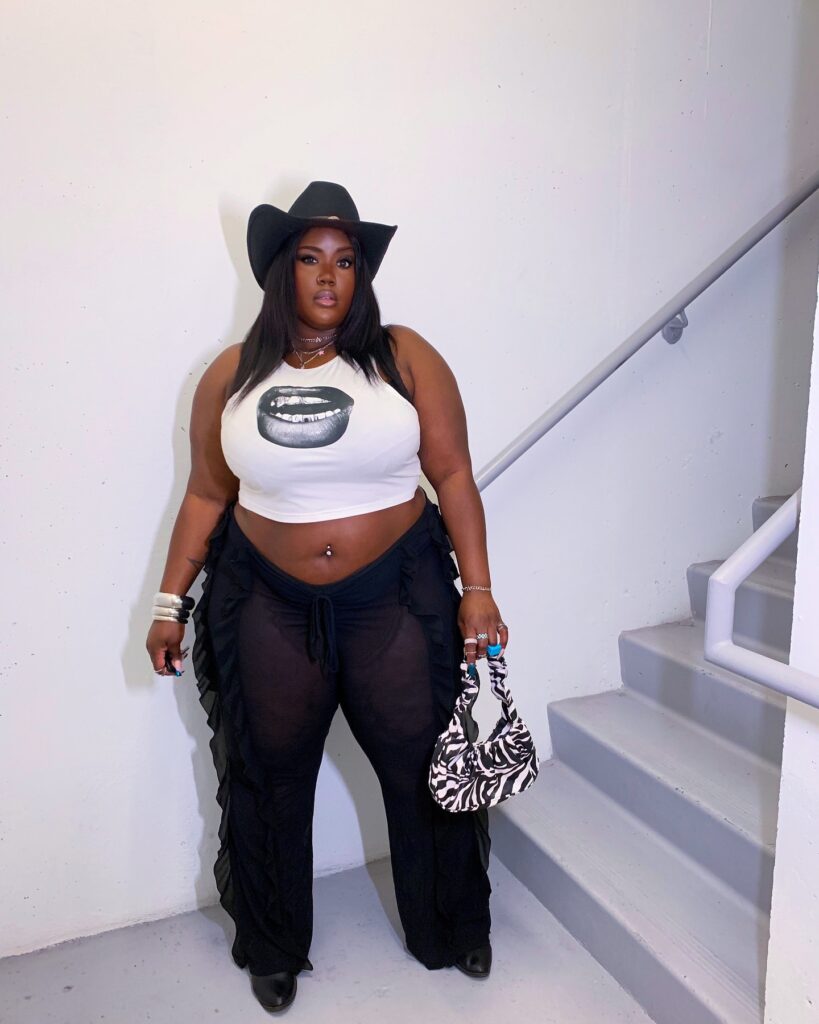 This plus-size cowgirl outfit takes a daring turn with a mix of sheer and statement pieces. The white crop top featuring bold lip art sets an edgy tone, while the high-waisted black mesh pants bring drama and movement with their layered ruffle sides.