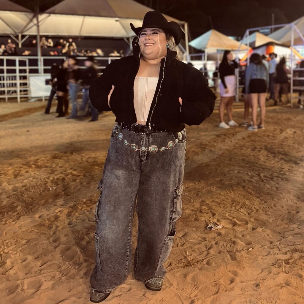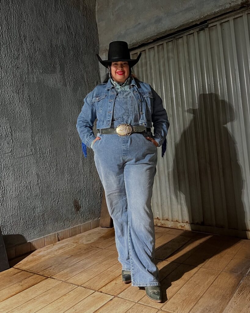 A subtle striped shirt adds texture underneath, while the oversized western belt with a statement buckle defines the waist beautifully. Topped off with a structured black cowboy hat, this look captures that authentic rodeo charm with modern flair. It’s a strong and empowering take on classic cowgirl style.