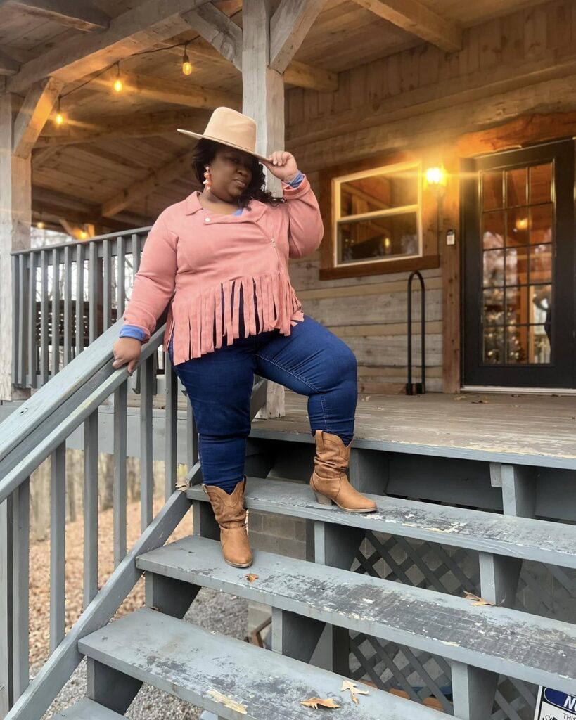 This plus-size cowgirl outfit is all about cozy confidence and rustic charm. The soft pink fringe jacket adds movement and personality, giving a playful twist to the structured look. Paired with dark-wash skinny jeans, the silhouette is sleek yet comfortable—perfect for casual outings or cabin getaways.