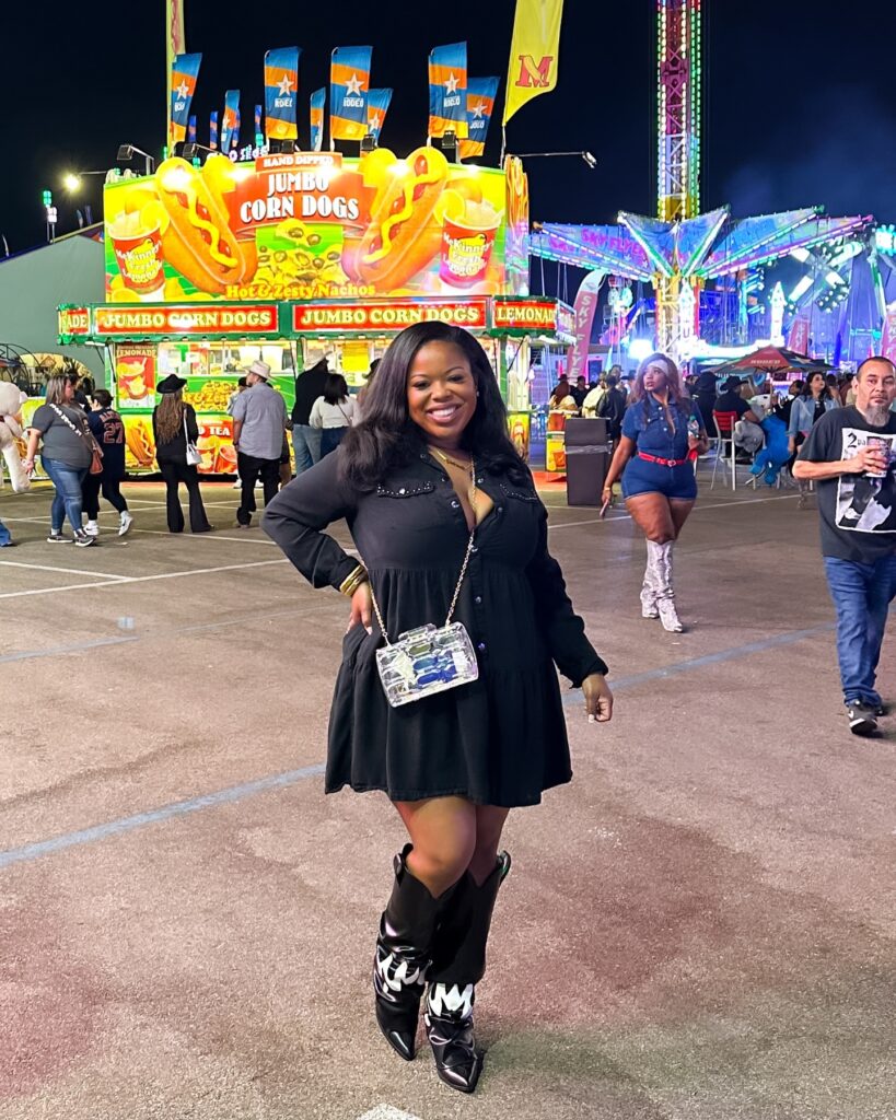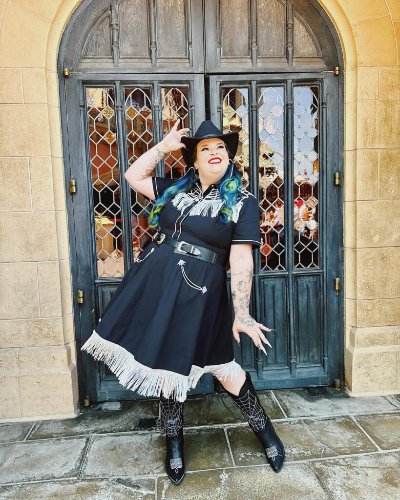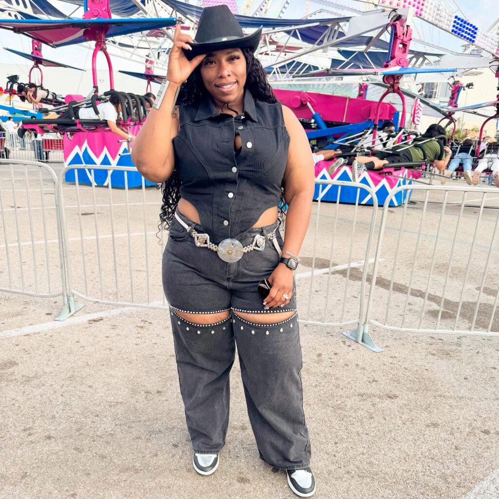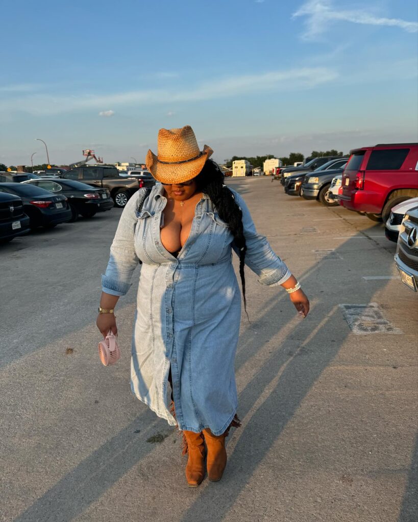 The fitted silhouette shows off curves confidently, making it perfect for festivals, fairs, or photoshoots. Paired with studded black ankle boots and a classic black cowgirl hat, this look is stylish and bold. It’s a confident mix of trendy and country with just the right amount of attitude.