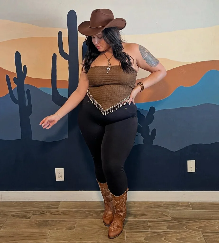 This plus-size cowgirl outfit is sleek, sultry, and perfect for desert vibes. The strapless brown top with a pointed hem and dangling embellishments adds a playful, boho flair while emphasizing curves.
