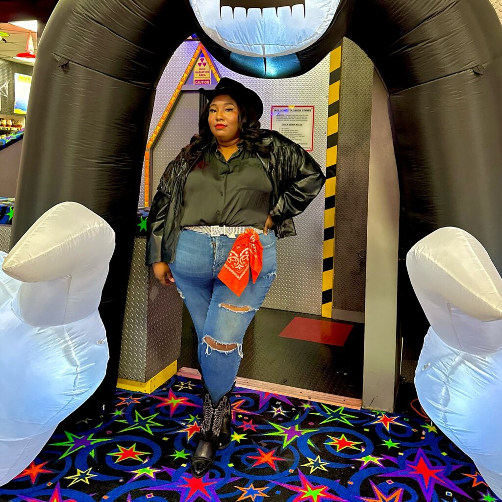 Distressed denim jeans keep things edgy, while the rhinestone belt and red bandana tucked at the waist deliver standout detail. Finished with classic black cowboy boots and a wide-brim hat, this look is perfect for nightlife, concerts, or themed events. It’s confident, fashionable, and full of big cowgirl energy.