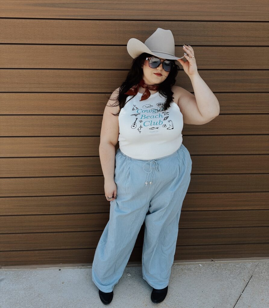 This plus-size cowgirl outfit blends casual comfort with cool Western energy. The white graphic tank keeps things light and playful, while the high-waisted, loose-fit striped pants offer a breezy silhouette that’s perfect for warm days.