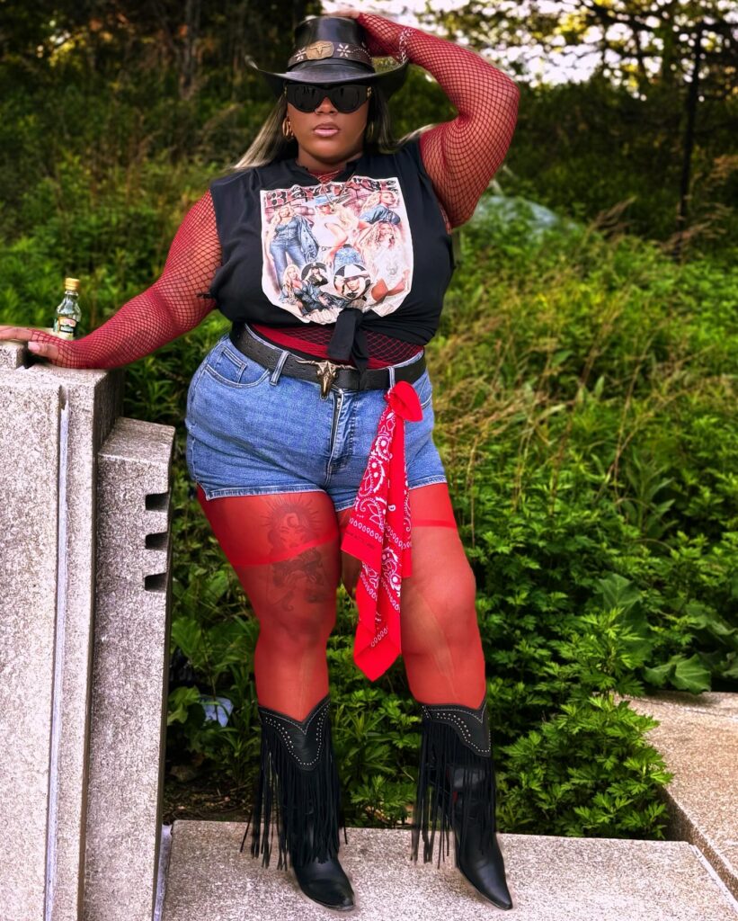 This plus-size cowgirl outfit delivers bold attitude with a rock-inspired twist. A knotted graphic tee over a red fishnet top creates a fierce layered look, while high-waisted denim shorts bring in classic Western flavor.