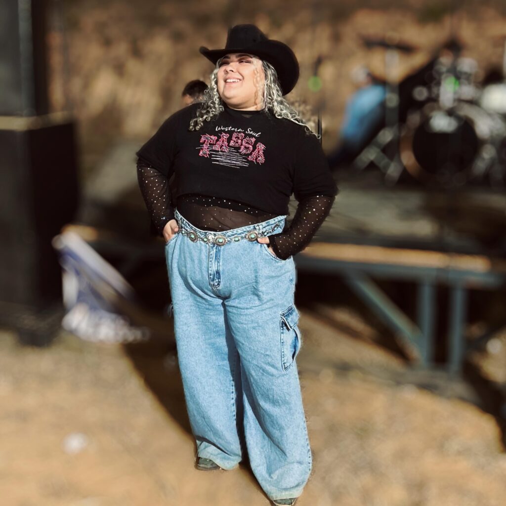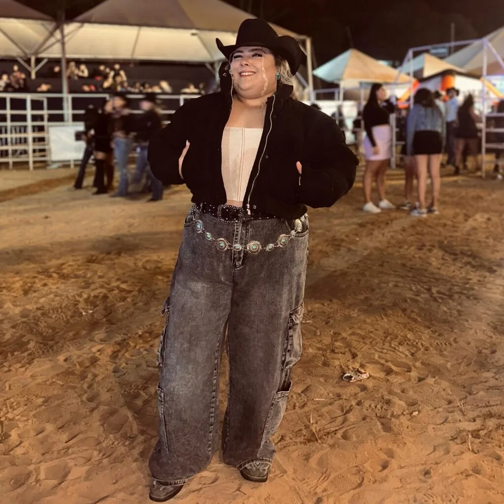 High-waisted wide-leg jeans in a soft wash offer a relaxed fit, while the turquoise concho belt adds standout Western detail. Topped with a classic black cowboy hat, this look is perfect for concerts, fairs, or casual rodeo nights. It’s stylish, comfortable, and full of Western charm with a modern twist.