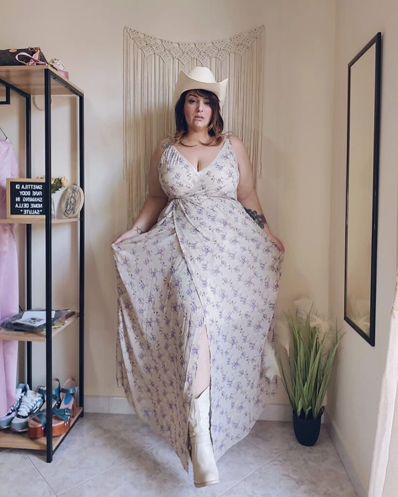 This plus-size cowgirl outfit is sweet, breezy, and effortlessly charming. The light floral maxi dress flows with a soft silhouette and features a flattering wrap-style front that enhances the shape beautifully.