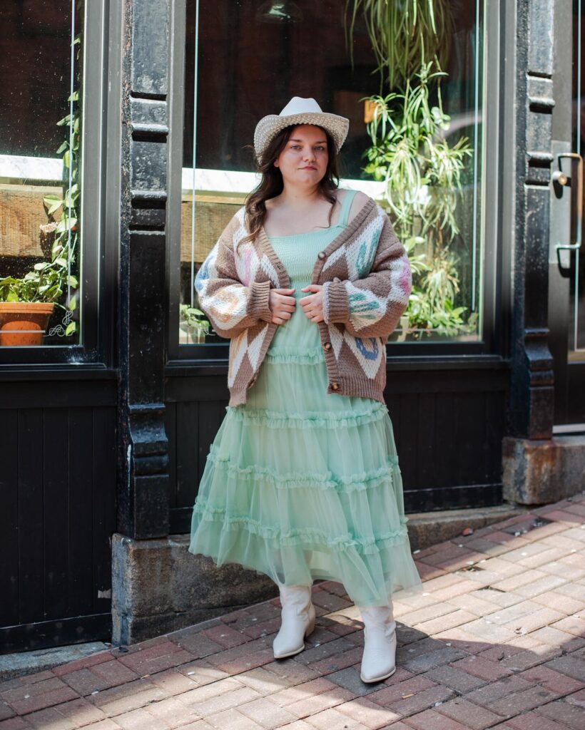 This plus-size cowgirl outfit blends delicate romance with rustic charm. The mint green tiered dress brings a dreamy, feminine silhouette, while the chunky knit cardigan adds warmth and Southwestern texture.