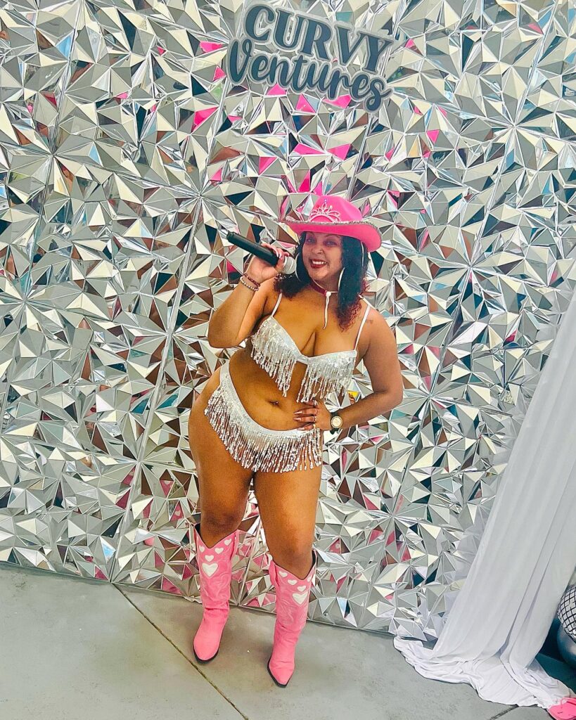 Bold pink cowboy boots with heart accents add a fun, playful touch, while the matching pink hat completes the glam rodeo queen vibe. Ideal for themed parties, festivals, or performances, this daring look celebrates curves, confidence, and cowgirl energy with every sparkling detail.