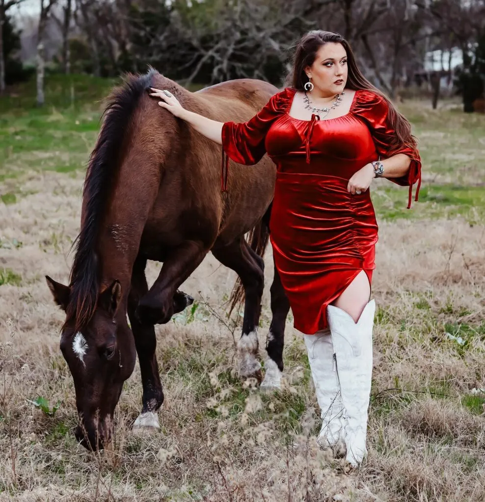 This plus-size cowgirl outfit exudes elegance with Western flair. The rich red velvet dress hugs curves beautifully, with ruched sleeves and a thigh-high slit adding dramatic detail. The texture brings a luxurious feel, perfect for fall or winter countryside shoots.