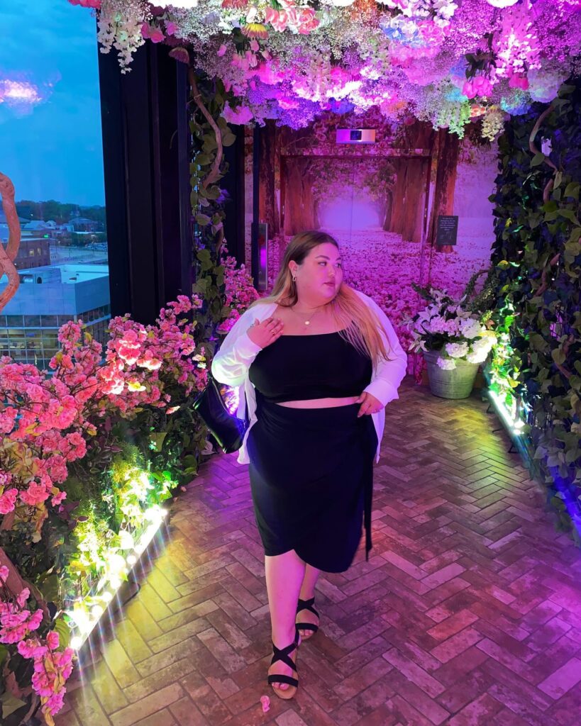 This plus size date night outfit pairs confidence with style. The sheer black top, designed with bold floral details, adds a daring and flirty edge. Its plunging neckline enhances the outfit’s sultry vibe while balancing femininity and boldness.
