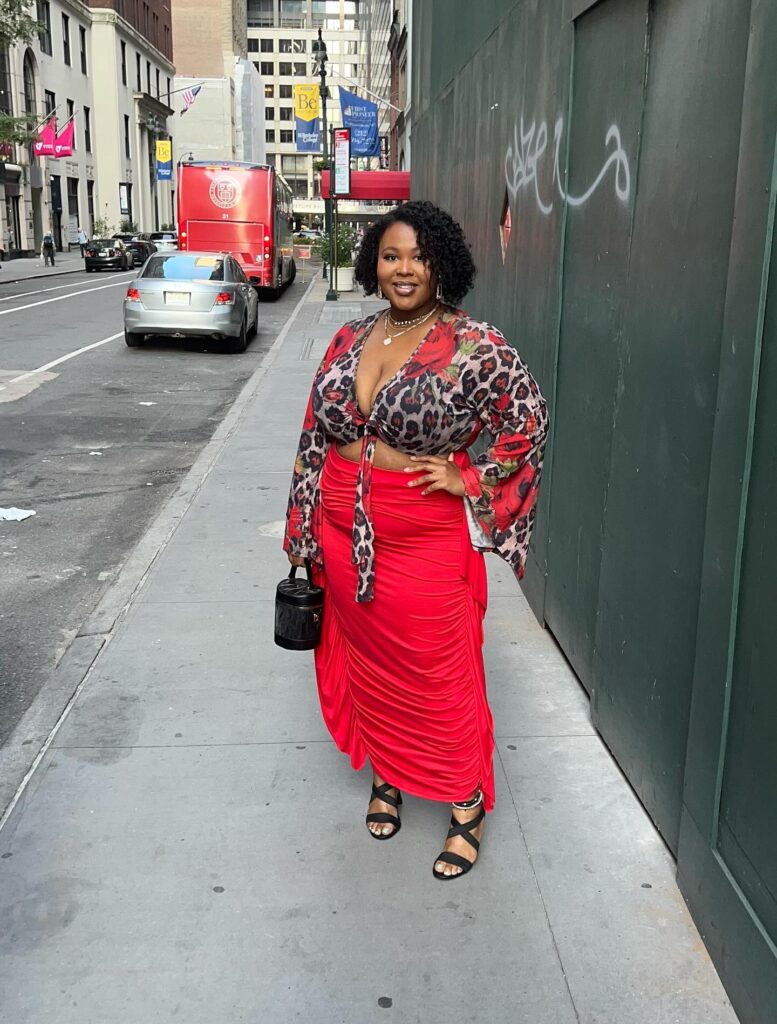 This plus size dinner date night outfit is daring, vibrant, and full of confidence. The striking red ruched skirt creates a figure-flattering silhouette with playful texture and movement.