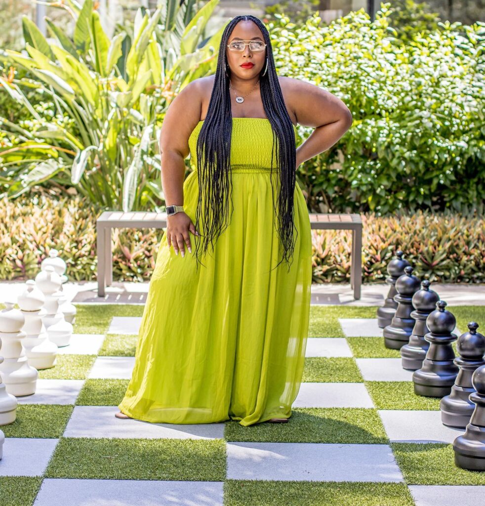 This plus size dinner date night outfit is vibrant, bold, and effortlessly eye-catching. The strapless lime green jumpsuit features a smocked bodice that flatters the upper body while offering comfortable structure.