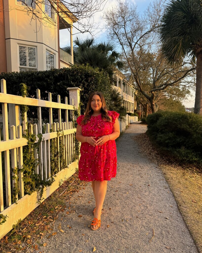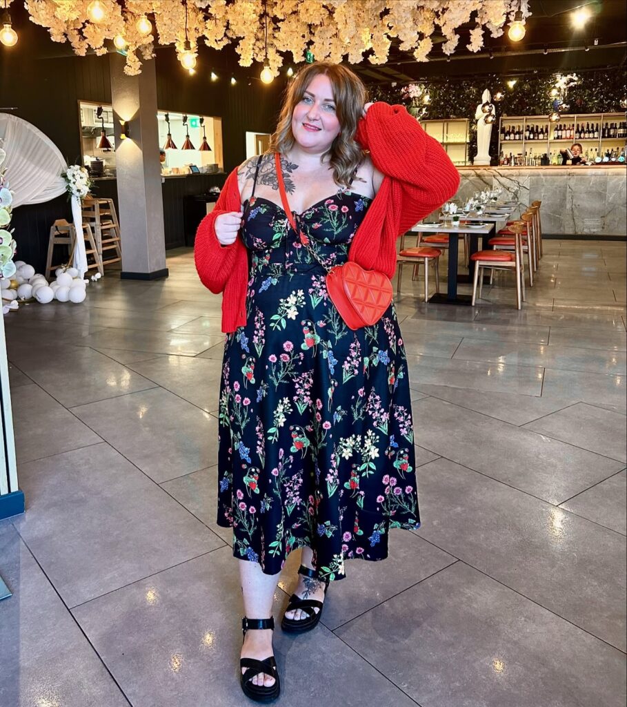 This plus size dinner date night outfit radiates charm and effortless elegance. The vibrant red mini dress, adorned with a delicate floral print, creates a cheerful and romantic look.