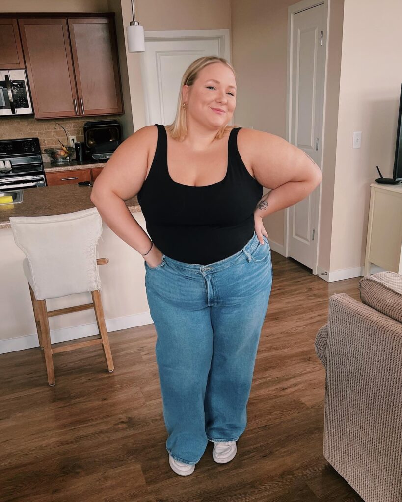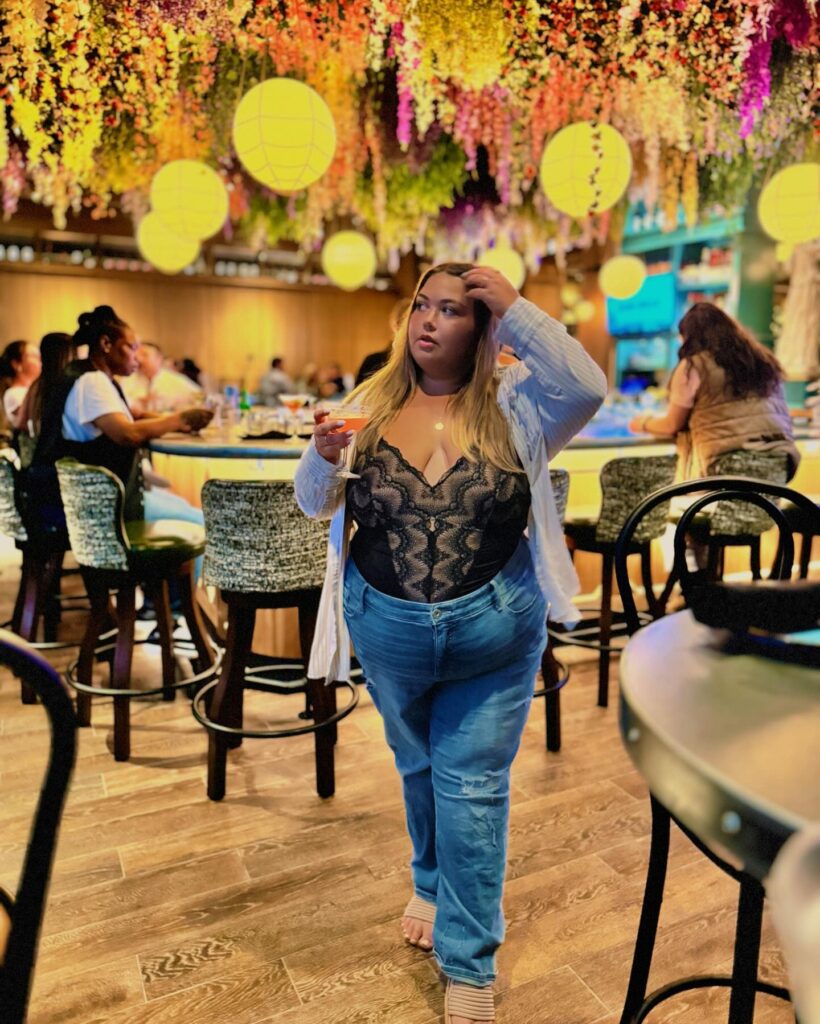 This plus size date night outfit perfectly blends sultry and casual style. The black lace bodysuit creates a striking, feminine focal point with its deep neckline and intricate detailing.