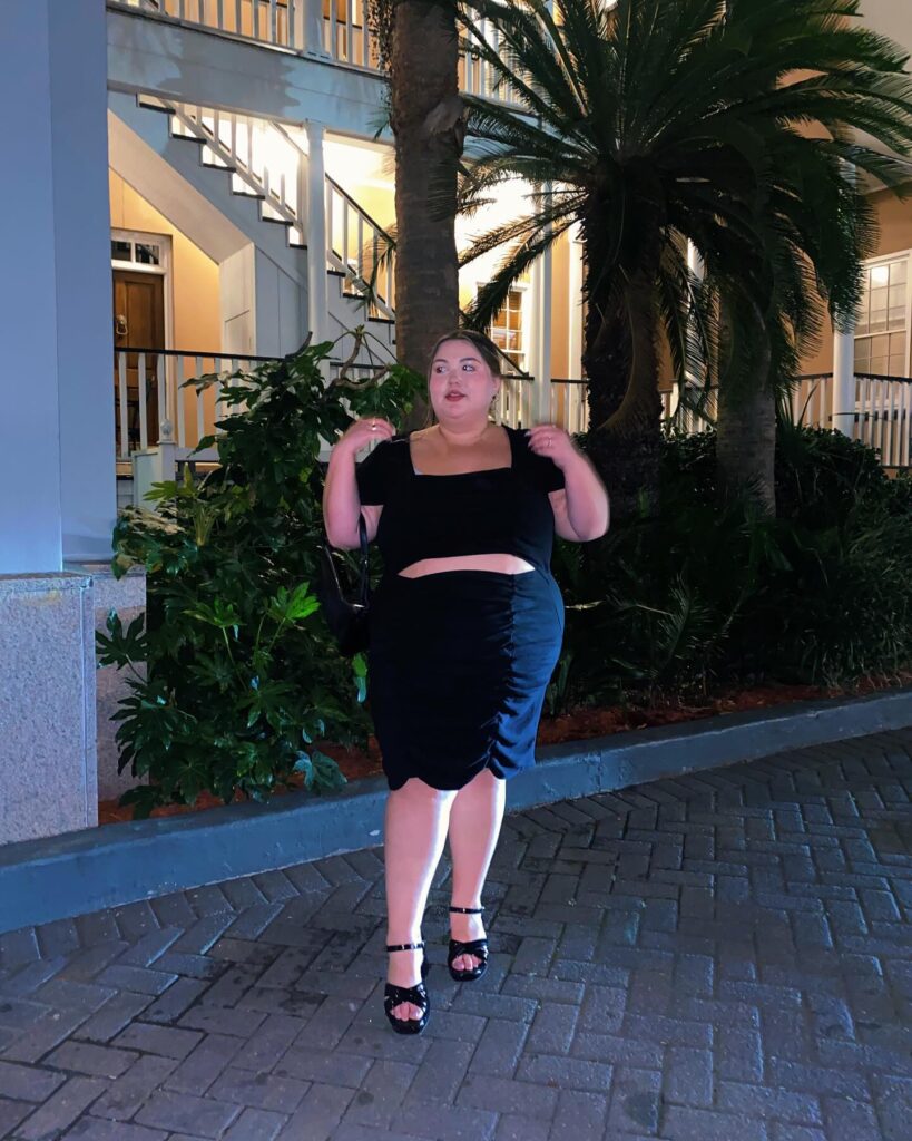 This plus size dinner date night outfit blends chic minimalism with subtle sophistication. The sleek black crop top paired with a matching wrap skirt creates a modern, flattering silhouette.