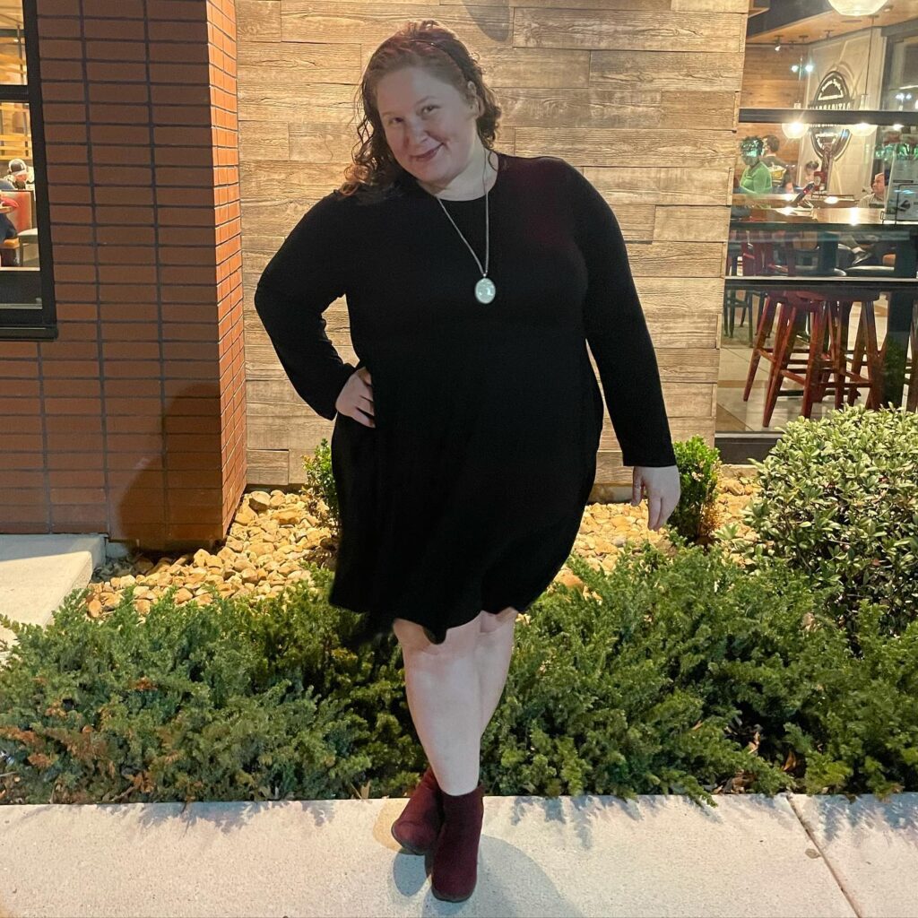 This plus size dinner date night outfit keeps things timeless and stylish with a versatile black dress. The long sleeves add a touch of sophistication, while the simple silhouette flatters effortlessly, making it perfect for any evening setting.