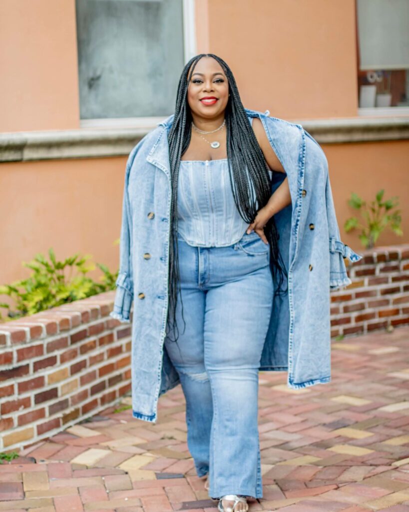 This plus size dinner date night outfit delivers a chic, coordinated denim-on-denim statement. The structured light-wash corset top defines the waist while adding a touch of modern femininity.