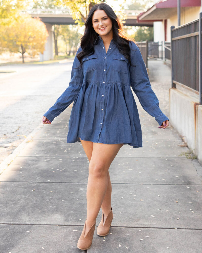 This plus size dinner date night outfit is casual yet effortlessly stylish. The denim shirt dress features long sleeves, a button-down front, and a slightly flared hemline, creating a flattering and comfortable silhouette.