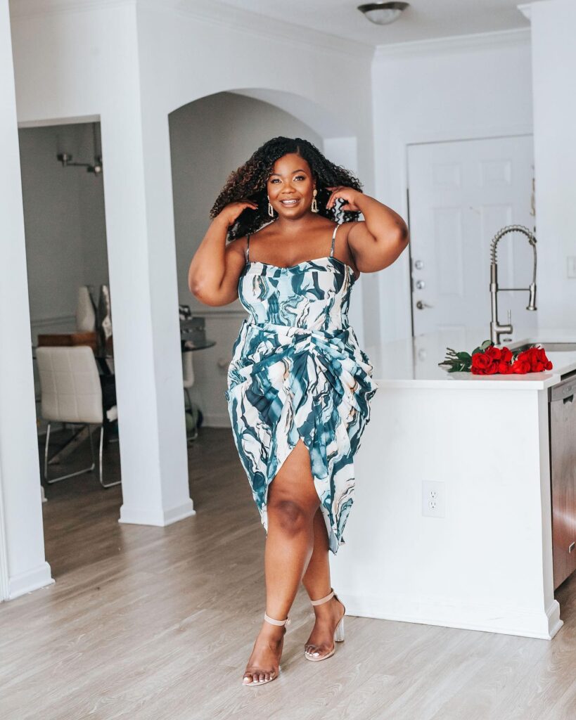 This plus size dinner date night outfit is effortlessly chic and feminine. The sleeveless printed wrap dress features delicate spaghetti straps and a flattering knot detail at the waist, creating beautiful draping.
