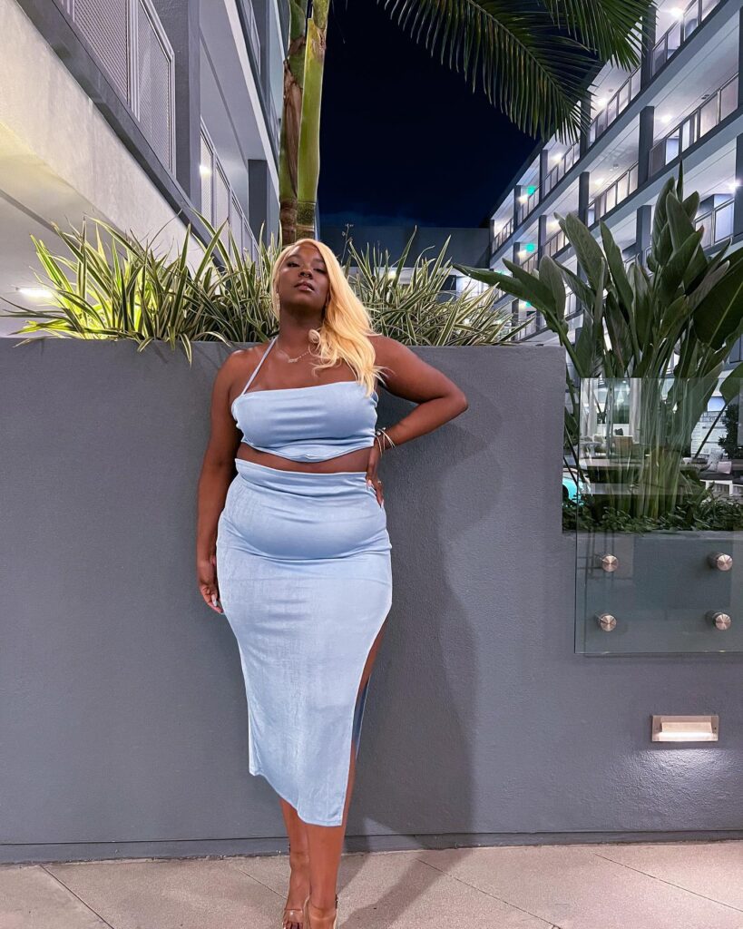 This plus size dinner date night outfit is sleek, modern, and undeniably striking. The halter-style crop top in soft light blue highlights the shoulders, adding a flirty and confident edge.