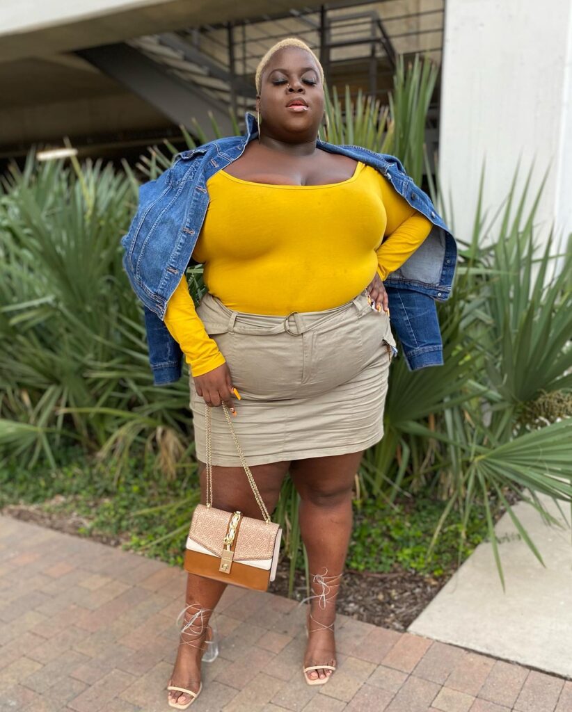 Paired with a fitted khaki mini skirt, the look balances brightness with a neutral base, highlighting curves with a structured finish. A denim jacket draped casually over the shoulders introduces a relaxed, layered touch.