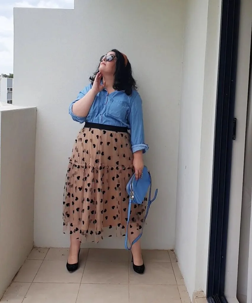This plus size dinner date night outfit combines playful charm with classic style. The light denim shirt, worn tucked in, creates a casual yet polished upper half.