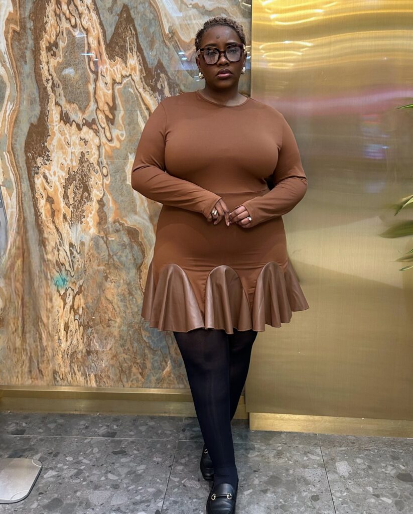 This plus size dinner date night outfit is chic, modern, and polished. The fitted brown long-sleeve dress highlights curves gracefully while keeping the look sophisticated.