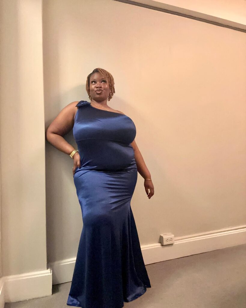 This plus size dinner date night outfit exudes timeless sophistication and elegance. The one-shoulder royal blue satin gown creates a sleek, elongated silhouette with its smooth, figure-hugging design.