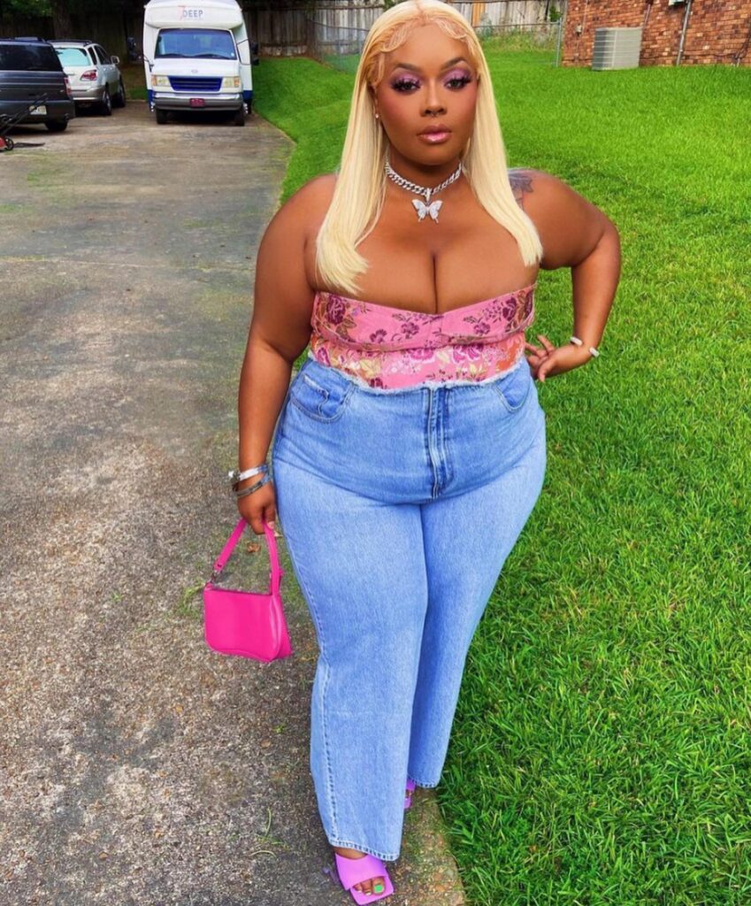This plus size dinner date night outfit blends bold color with casual flair. The strapless pink floral top highlights the neckline, adding a feminine and flirty touch. Paired with high-waisted wide-leg jeans, the look balances structure with relaxed confidence, creating a flattering silhouette.