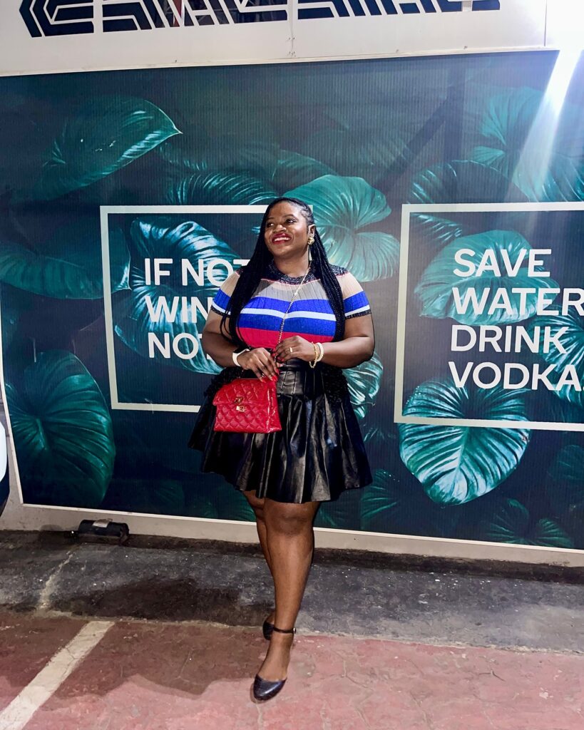 This plus size dinner date night outfit mixes bold color with chic textures. The fitted striped top in blue, white, and red brings a playful yet polished touch.