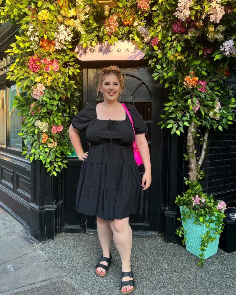 This plus size date night outfit strikes the perfect mix of romance and playfulness. The black midi dress features a vibrant floral print, adding charm and feminine elegance with its fitted bodice and flowing skirt.