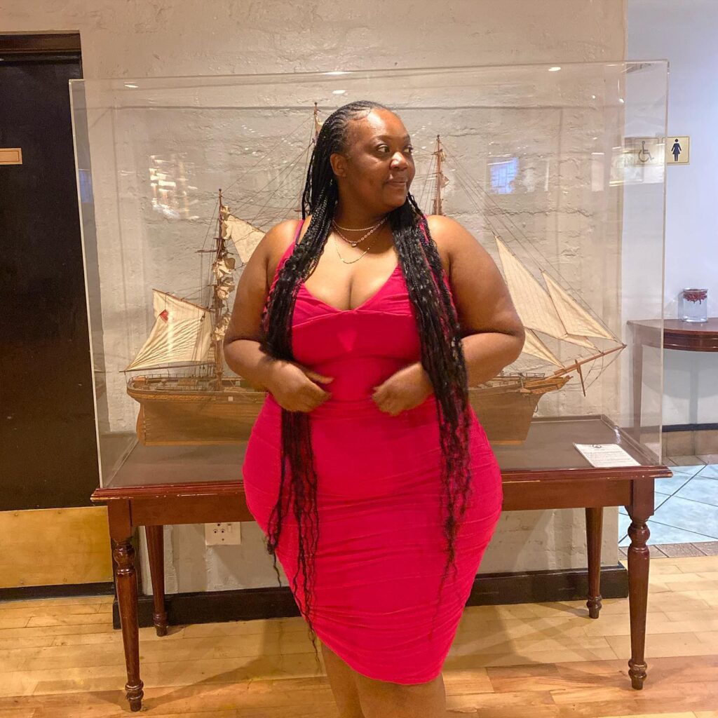 This plus size dinner date night outfit is bold, confident, and figure-flattering. The hot pink bodycon dress hugs curves beautifully, creating a striking silhouette perfect for evening outings.