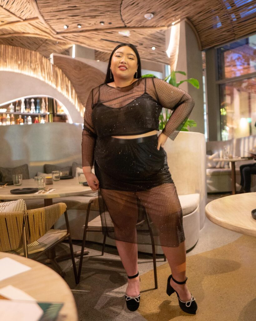 This plus size dinner date night outfit is daring, glamorous, and modern. The base features a sleek black crop top and fitted skirt, creating a bold and confident silhouette. Layered over is a sheer, long-sleeve mesh dress with subtle sparkles, adding texture and evening-ready allure.