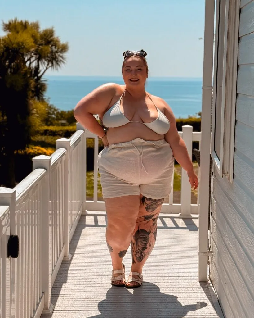 The shorts sit high on the waist, offering coverage while still keeping the look breezy. The outfit flatters a fuller midsection by drawing focus upward and adding balance through a minimal, chic bottom. It’s a confident and carefree choice for warm days spent by the water.