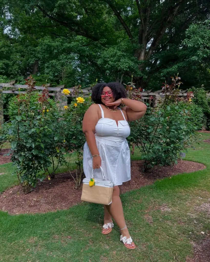 The fit-and-flare silhouette flatters curvier figures by accentuating the waist and creating balance. Perfect for garden strolls or brunch dates, this dress combines classic elegance with fresh, feminine vibes for plus-size women embracing sunny style with confidence.