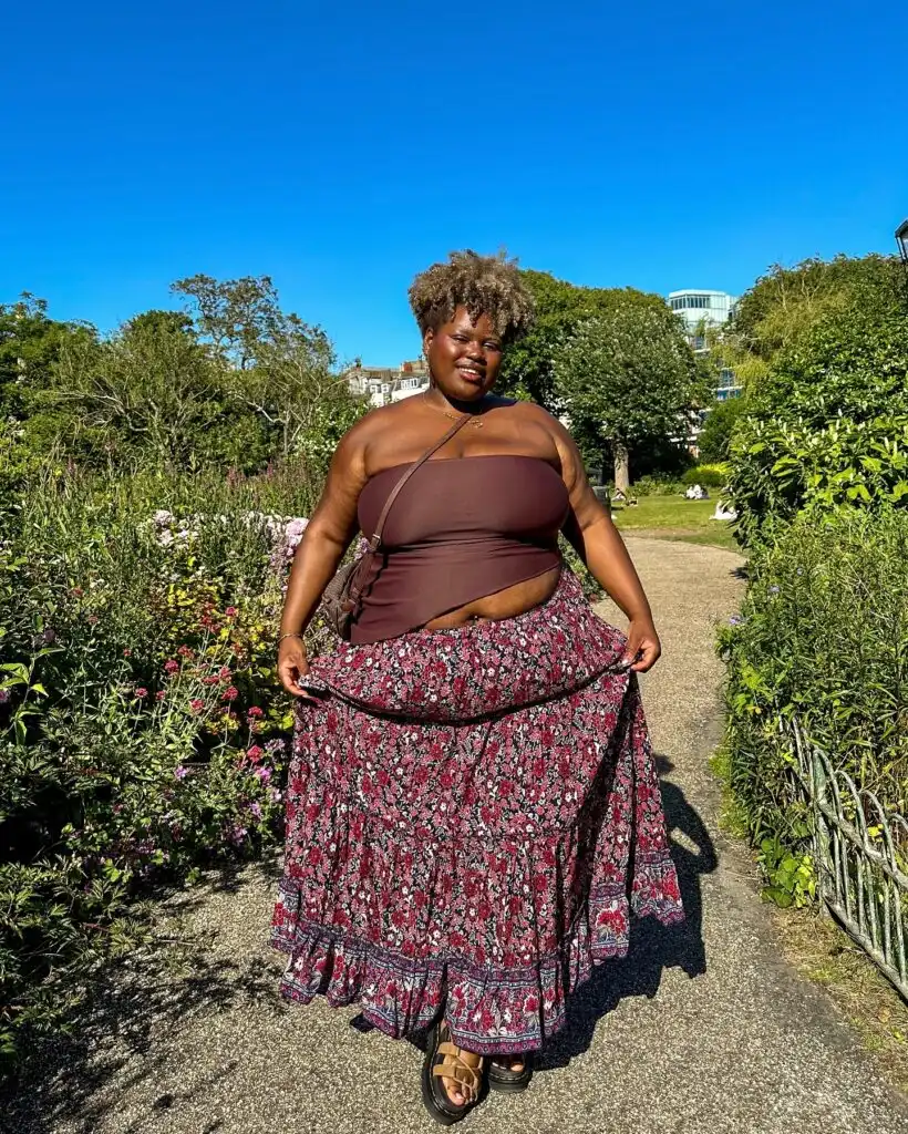 This summer-ready look pairs a rich brown strapless top with a flowing boho-style maxi skirt in a vibrant floral print. The asymmetric cut of the top adds a modern twist, while the skirt’s full silhouette offers comfort and coverage around the stomach area.