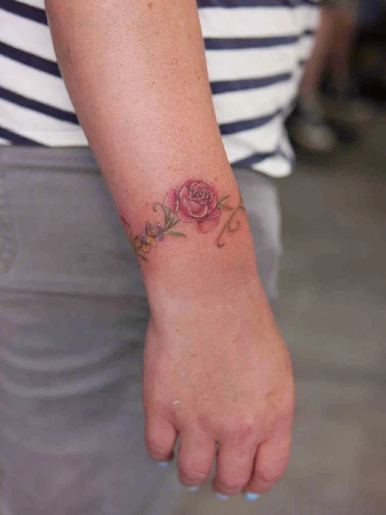 This tattoo wraps softly around the wrist like a floral bracelet, featuring a dainty pink rose paired with tiny purple and yellow blooms.